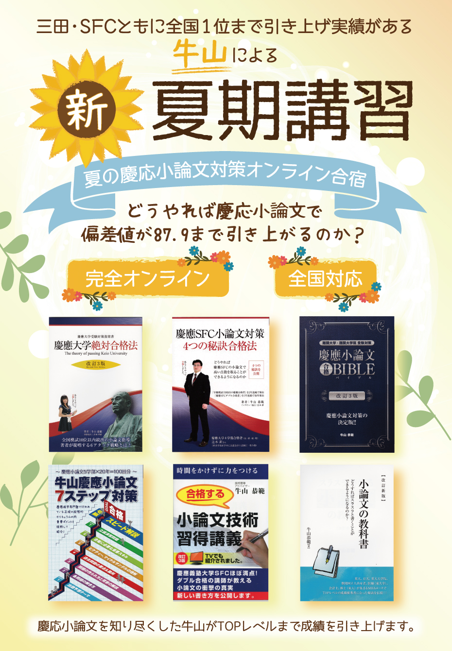 慶應クラスは、慶應大学に、絶対合格を目指す人の慶應大学合格者による、慶應合格のための受験対策専門塾(通信制)です。慶應大学にお任せで合格するための『塾長牛山とマンツーマンレッスンコース』は、手間が非常にかかるので人数限定(若干名)となります。