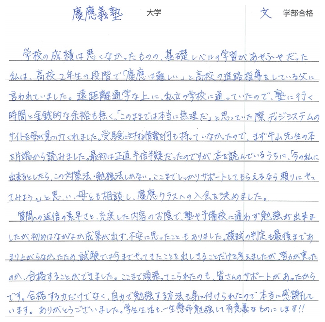 竹内さんは、経済学部、商学部、環境情報学部に合格しました。合格後、弊社まで来社してくれました。たくさんお話しを聞きました。詳しくは動画をご覧ください。その他の受講生の合格証と直筆のお手紙は「詳細を見る」クリックしてください。 詳細を見る 辻本さんは、経済学部、法学部、総合政策、環境情報学部の4つの学部に合格しました。合格戦略は、合格最低点を上回る事と併願戦略と答えてくれました。上記の他に、弊社のサポートや講座など答えてくれています。合格書なども掲載しています。詳しくはクリックしてください。 詳細を見る 平井さんは、総合政策学部、環境情報学部のダブル合格しました。合格戦略は意識と考え方を変える事と答えてくれました。平井さんは、模試で全国6位にもなっています。詳しくは、動画をご覧ください。その他の受講生の合格証と直筆のお手紙は「詳細を見る」クリックしてください。 詳細を見る 間瀬さんは、弊社の小論文対策は日本一だと思いますと話してくださいました。その理由などお話頂きました。詳しくは動画をご覧ください。間瀬さんの合格証やその他の受講生の合格証と直筆のお手紙は「詳細を見る」クリックしてください。 詳細を見る 中村さんは、模試で小論文全国10位になっています。詳しくは、動画をご覧ください。中村さんの合格証やその他の受講生の合格証と直筆のお手紙は「詳細を見る」クリックしてください。 詳細を見る 李さんは、合格後すぐにTELで報告してくださいました。詳しくは動画をご覧ください。間瀬さんの合格証やその他の受講生の合格証と直筆のお手紙は「詳細を見る」クリックしてください。 詳細を見る 中垣くんのお母様にも牛山の書籍などについてお話いただきました。「見た目は一番うさんくさかったですが・・・」詳しくは、動画をご覧ください。その他の受講生の合格証と直筆のお手紙は「詳細を見る」クリックしてください。 詳細を見る 法政大学合格後、太田さんは、翌年慶應大学に合格しています。太田さんの合格証やその他の受講生の合格証と直筆のお手紙は「詳細を見る」クリックしてください。 詳細を見る