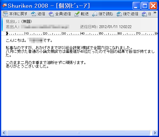 伏せています。模試の結果を送ってくれました。大体189人中3位になっているので、TOP3%
